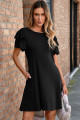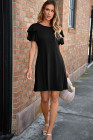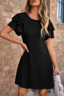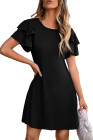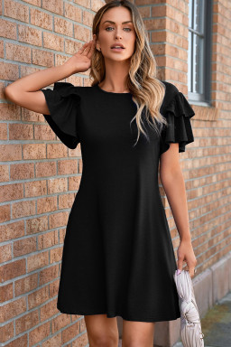 Black Solid Color Round Neck Double Ruffle Short Sleeve Dress